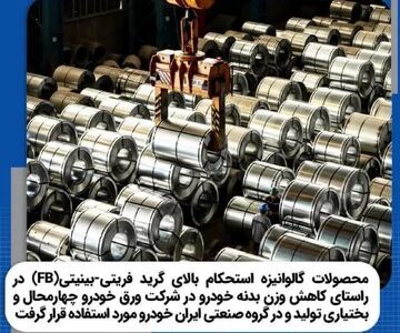 افتخاری دیگر درشرکت ورق خودرو چهارمحال وبختیاری رقم خورد محصولات گالوانیزه استحکام بالای گرید فریتی-بینیتی(FB) در راستای کاهش وزن بدنه خودرو در شرکت ورق خودرو چهارمحال و بختیاری تولید و در گروه صنعتی ایران خودرو مورد استفاده قرار گرفت.
